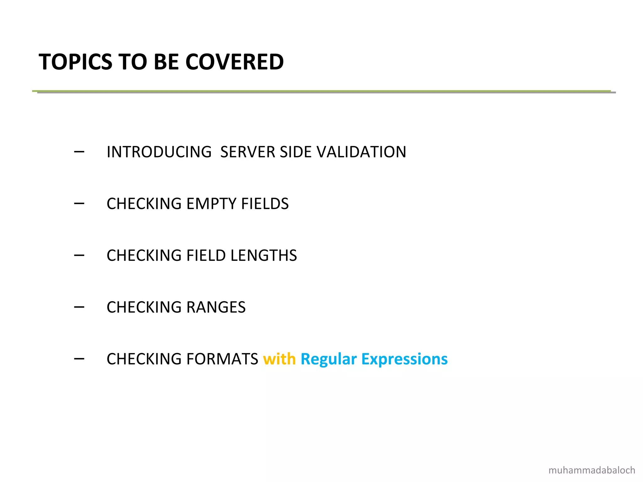 This document discusses server-side form validation in PHP. It covers checking for empty fields, field lengths, value ranges, and formats using regular expressions. Specific PHP functions discussed include preg_match() for pattern matching, preg_replace() for search and replace, and ereg() as an alternative to preg_match() for POSIX regular expressions. Examples are provided to validate dates, names, numbers, lengths, and ranges to restrict user-submitted form data to required standards before processing.