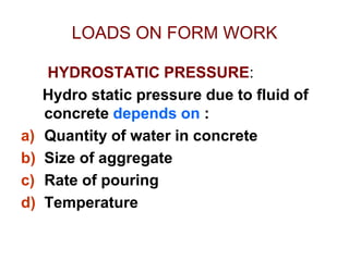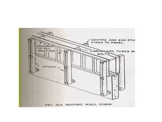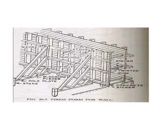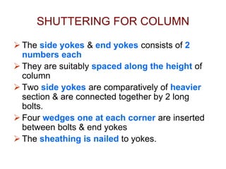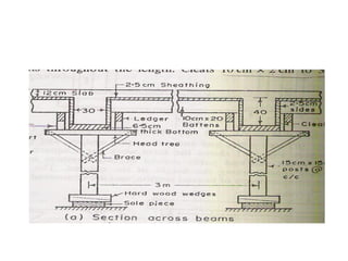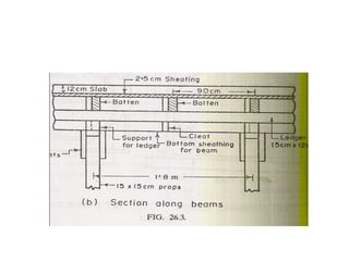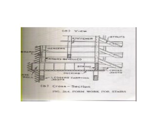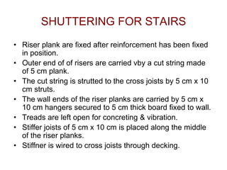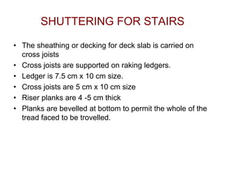 This document provides information on formwork used for constructing concrete structures. It discusses the different types of formwork including wooden, plywood, steel and combined forms. It also describes requirements for proper formwork like being waterproof and strong enough to support loads. Common formwork systems are described for columns, beams, slabs, stairs and walls. Standards for stripping formwork from concrete structures are also outlined according to the Indian Standard code.