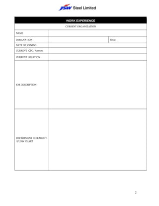 This document contains a personal information form requesting details such as name, date of birth, gender, qualifications, work experience, salary, and references. Sections include personal details, qualification details, current and previous work experience, salary details, references, and a signature agreeing the information provided is accurate.