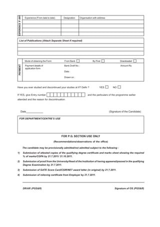 The document appears to be an application form for admission to postgraduate programs (Ph.D., M.Des., M.S.(Research), and M.Tech.) at the Indian Institute of Technology Delhi. It requests information such as the applicant's personal details, educational qualifications, GATE/CEED scores, work experience, proposed area of research, department/program choices, and payment details. The form also includes instructions for submission of additional documents and notes that incomplete applications may be provisionally accepted pending submission of required documents by specified dates.