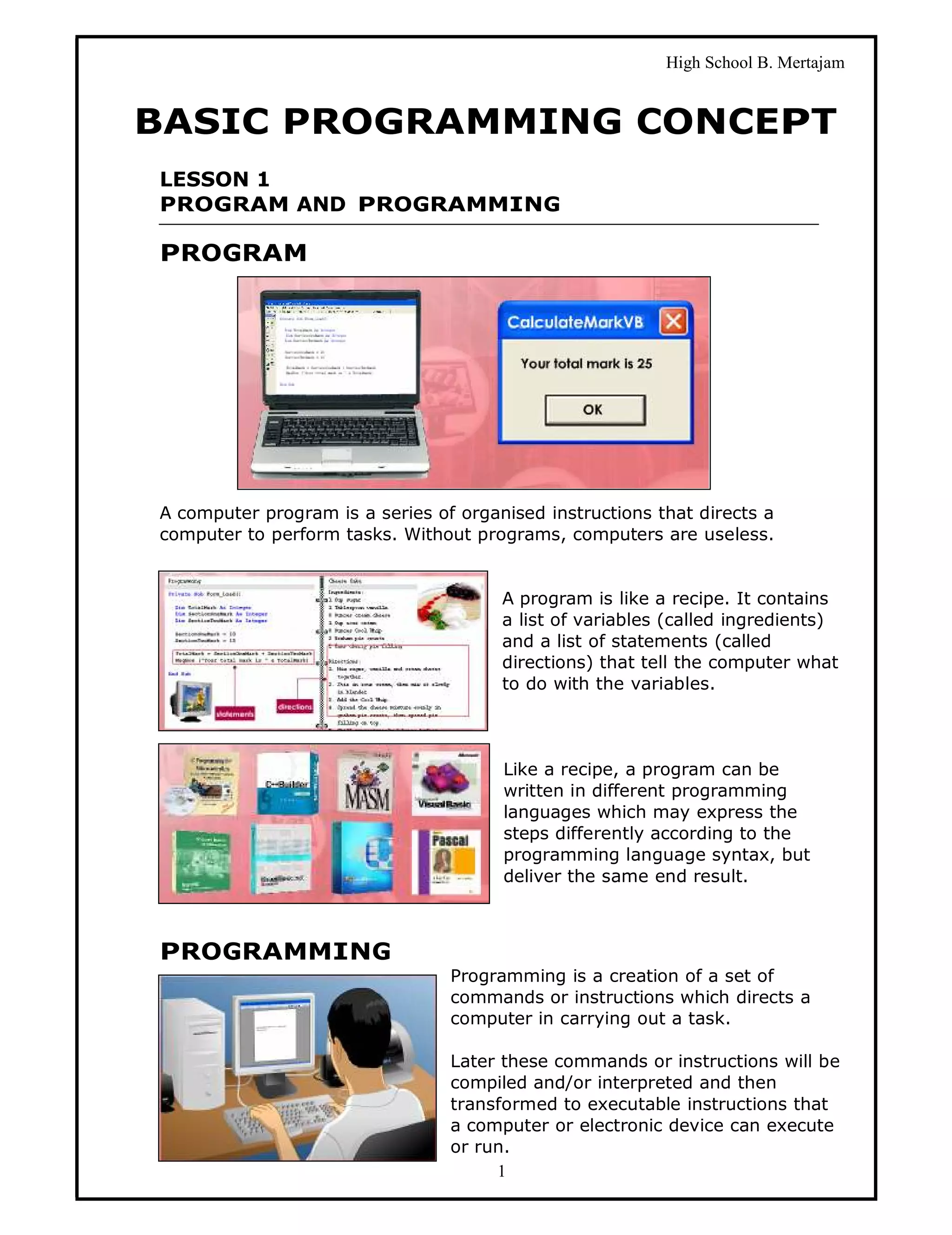 The document provides an introduction to basic programming concepts through 10 lessons: