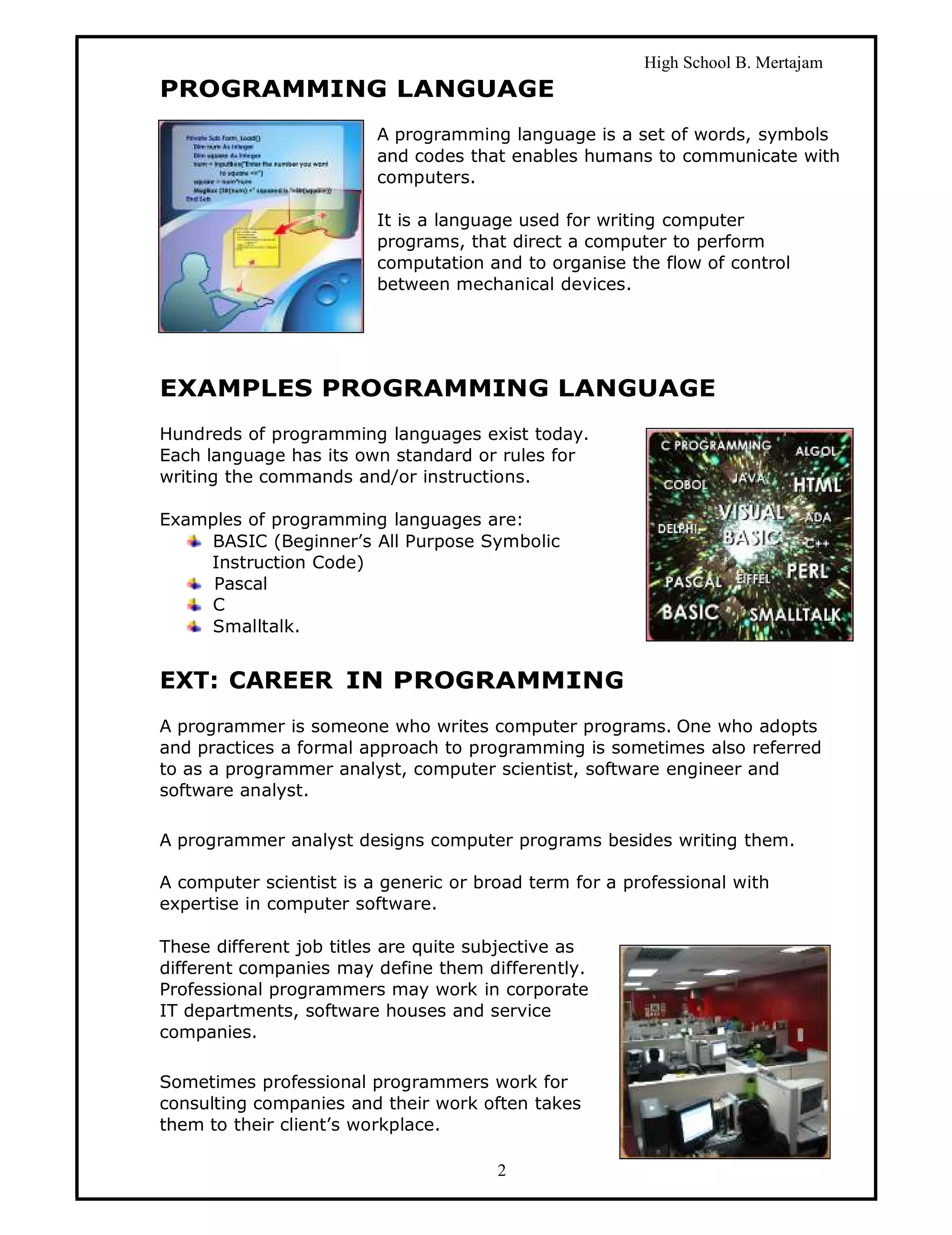 1) It defines programs, programming, and programming languages. Programs direct computers using organized instructions. Programming is creating commands to direct computers. Programming languages allow communication with computers.
