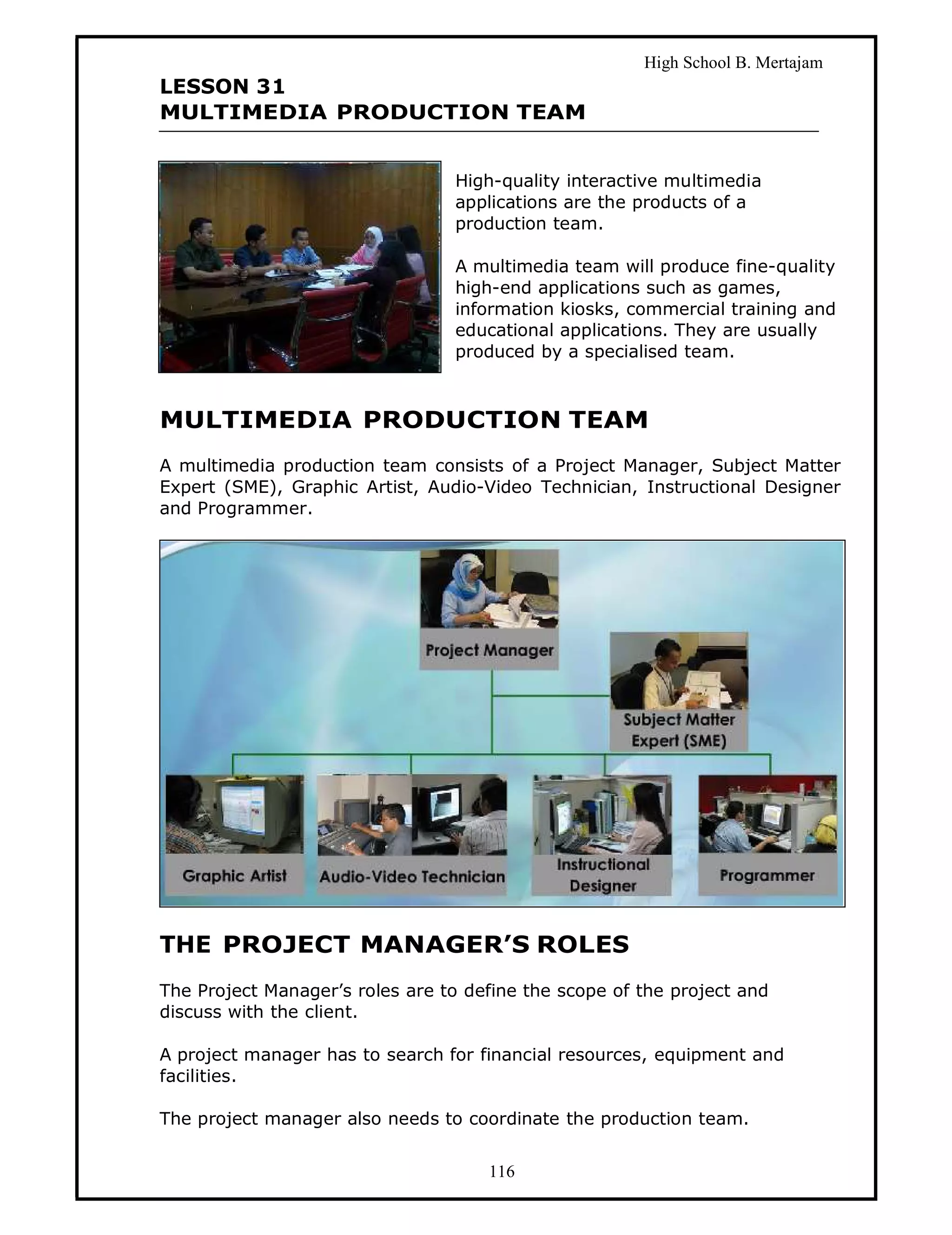 A multimedia production team consists of various roles including a project manager, subject matter expert, graphic artist, audio/video technician, instructional designer, and programmer. The project manager defines the project scope and coordinates the team. Each role contributes different elements - the subject matter expert provides content, the graphic artist develops visual elements, the audio/video technician records and edits sound/video, the instructional designer plans educational strategies, and the programmer codes the program. The team goes through various phases from analysis to design, implementation, testing, evaluation, and publishing to produce high-quality multimedia applications.