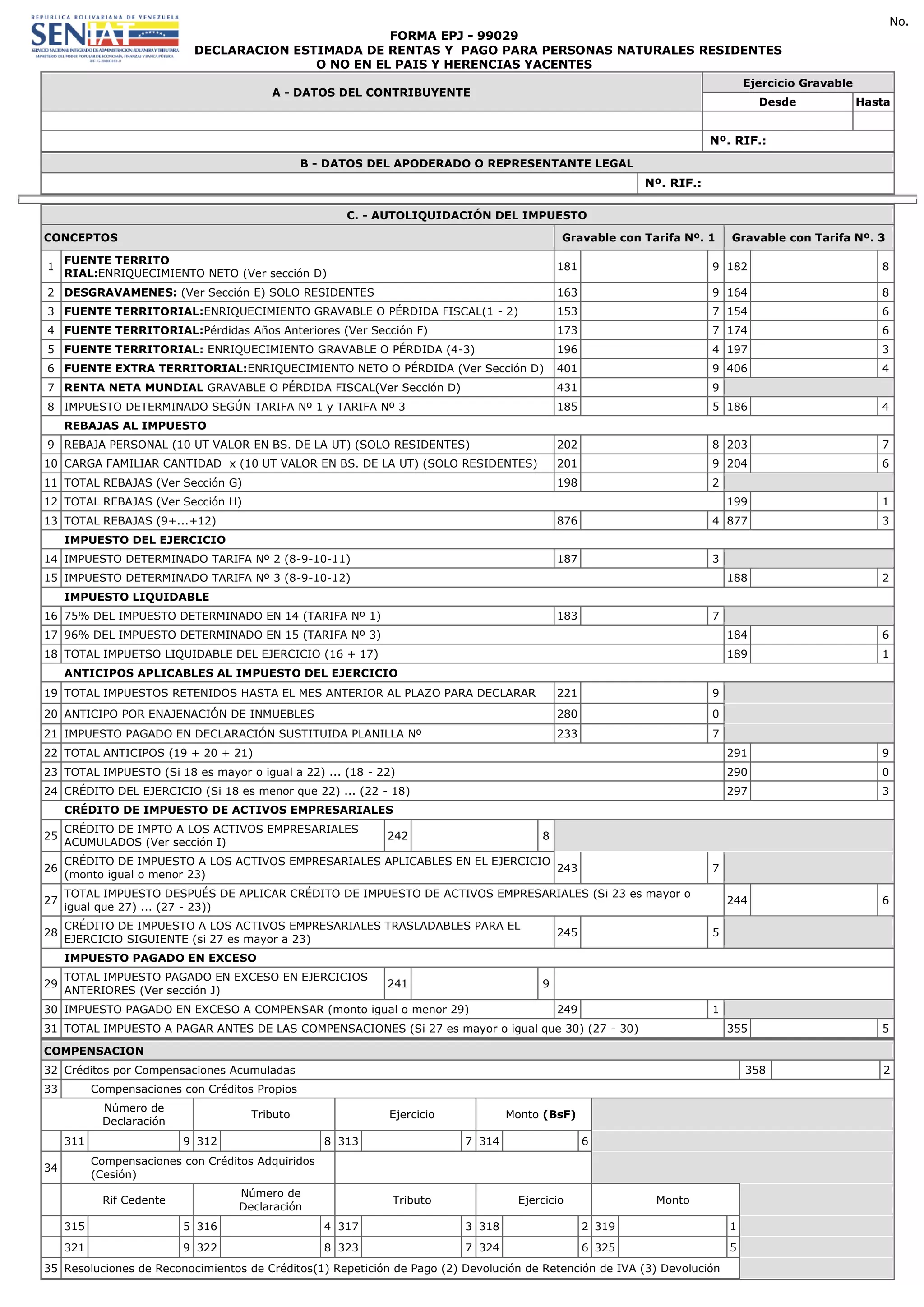 Este documento es una declaración de impuestos que resume los datos del contribuyente, los cálculos de impuestos adeudados y pagados, créditos fiscales, compensaciones y saldos de impuestos. Incluye secciones para los datos del contribuyente, cálculo del impuesto, desgravaciones personales, pérdidas de años anteriores, inversiones estimadas, créditos de impuestos de activos empresariales e impuestos pagados en exceso en años anteriores.