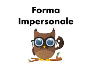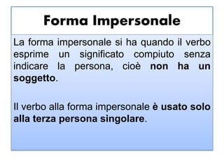 Il documento tratta la forma impersonale dei verbi in italiano, in particolare quando non indicano un soggetto. Vengono forniti esempi di verbi impersonali, espressioni con 'essere' e 'andare' e la distinzione tra 'si' impersonale e 'si' passivante. Si sottolineano anche regole grammaticali relative all'uso della terza persona e all'accordo del participio passato.
