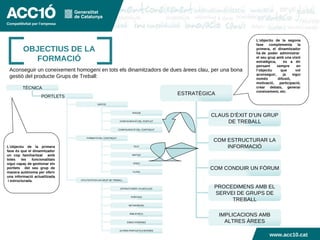L’objectiu de laprimera fase és que el dinamitzador un cop familiaritzat amb totes les funcionalitats sigui capaç de gestionar els portlets del seu grup de manera autònoma per oferir una informació actualitzada i estructurada. Títol capítol OBJECTIUS DE LA FORMACIÓ Aconseguir un coneixement homogeni en tots els dinamitzadors de dues àrees clau, per una bona gestió del producte Grups de Treball: L’objectiu de la segona fase complementa la primera, el dinamitzador ha de poder administrar el seu grup amb una visió estratègica, es a dir pensant sempre en l’objectiu que vol aconseguir, ja sigui només difusió, motivació, participació, crear debats, generar coneixement, etc. TÈCNICA PORTLETS GESTIÓ FORMATS DEL CONTINGUT UTILITZATS EN UN GRUP DE TREBALL AFEGIR CONFIGURACIÓ DEL PORTLET CONFIGURACIÓ DEL CONTINGUT TEXT IMATGE VÍDEO FLASH ESTRUCTURES I PLANTILLES NETWORKING BIBLIOTECA EINES INTERNES ALTRES PORTLETS D’INTERÈS PORTADA ESTRATÈGICA CLAUS D’ÈXIT D’UN GRUP DE TREBALL COM ESTRUCTURAR LA INFORMACIÓ COM CONDUIR UN FÒRUM PROCEDIMENS AMB EL SERVEI DE GRUPS DE TREBALL IMPLICACIONS AMB ALTRES ÀREES www.acc10.cat www.acc10.cat