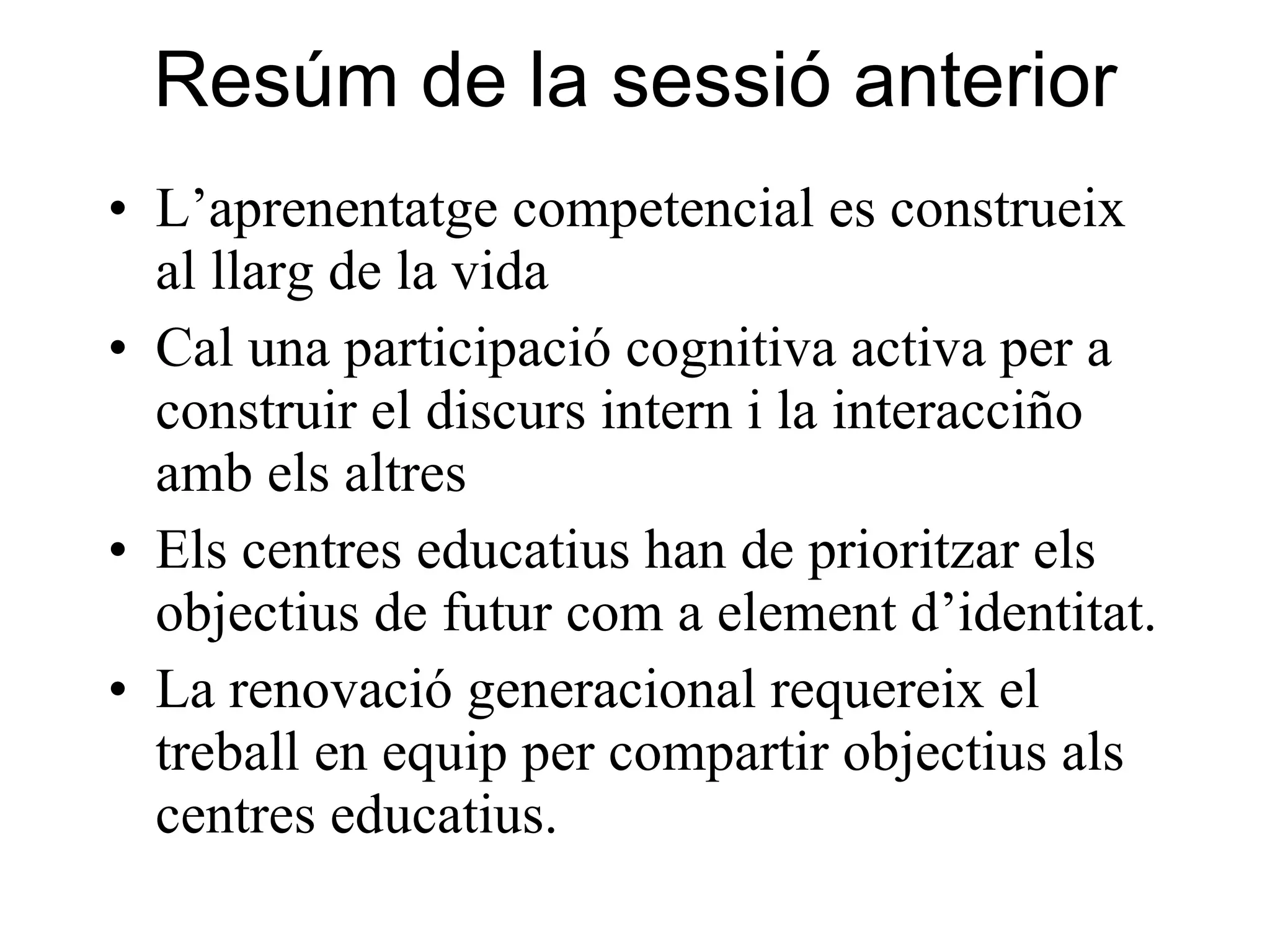 Resúm de lasessió anterior L’aprenentatge competencial es construeix al llarg de la vida Cal una participació cognitiva activa per a construir el discurs intern i la interacciño amb els altres Els centres educatius han de prioritzar els objectius de futur com a element d’identitat. La renovació generacional requereix el treball en equip per compartir objectius als centres educatius.