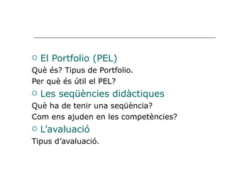 El Portfolio (PEL)Què és? Tipus de Portfolio. Per què és útil el PEL? Les seqüències didàctiques Què ha de tenir una seqüència? Com ens ajuden en les competències? L’avaluació Tipus d’avaluació.