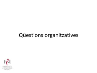 Primera dia d’aula1- Explicar els objectius del projecte 2- Repartir i explicar la documentació 3- Repartir el material 4- Explicar programa, mètode, avaluació del curs 5- Donar valor a l’aprenentatge de la llengua: millorar la seva ocupació i consolidar les relacions personals amb la comunitat