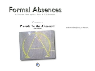 The document is an introduction to a theater piece by Bazz Atlas and KS Sheridan titled "Formal Absences". It describes how the two artists have collaborated musically for over 30 years by writing songs together. They had long discussed creating a theater piece but the time was not right until 2006 when they finally did so, which was the most satisfying collaboration they have had. The piece is presented as a multimedia collection that advances through songs when clicked on within the browser window.