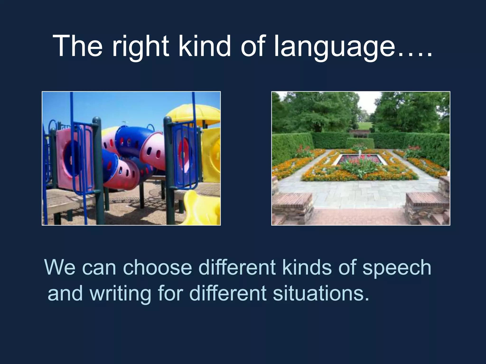 The document discusses formal and informal language and how to choose the appropriate type of language for different situations. It provides examples of informal language use with friends and family, as well as formal language use with people in positions of authority or that you don't know well. The document also includes examples of conversations that demonstrate formal and informal language and asks the reader to consider what type of language would be suitable in different scenarios like speaking with a school principal or on a playground.