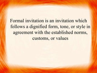 The document discusses the format and etiquette for formal written invitations. It provides examples of: