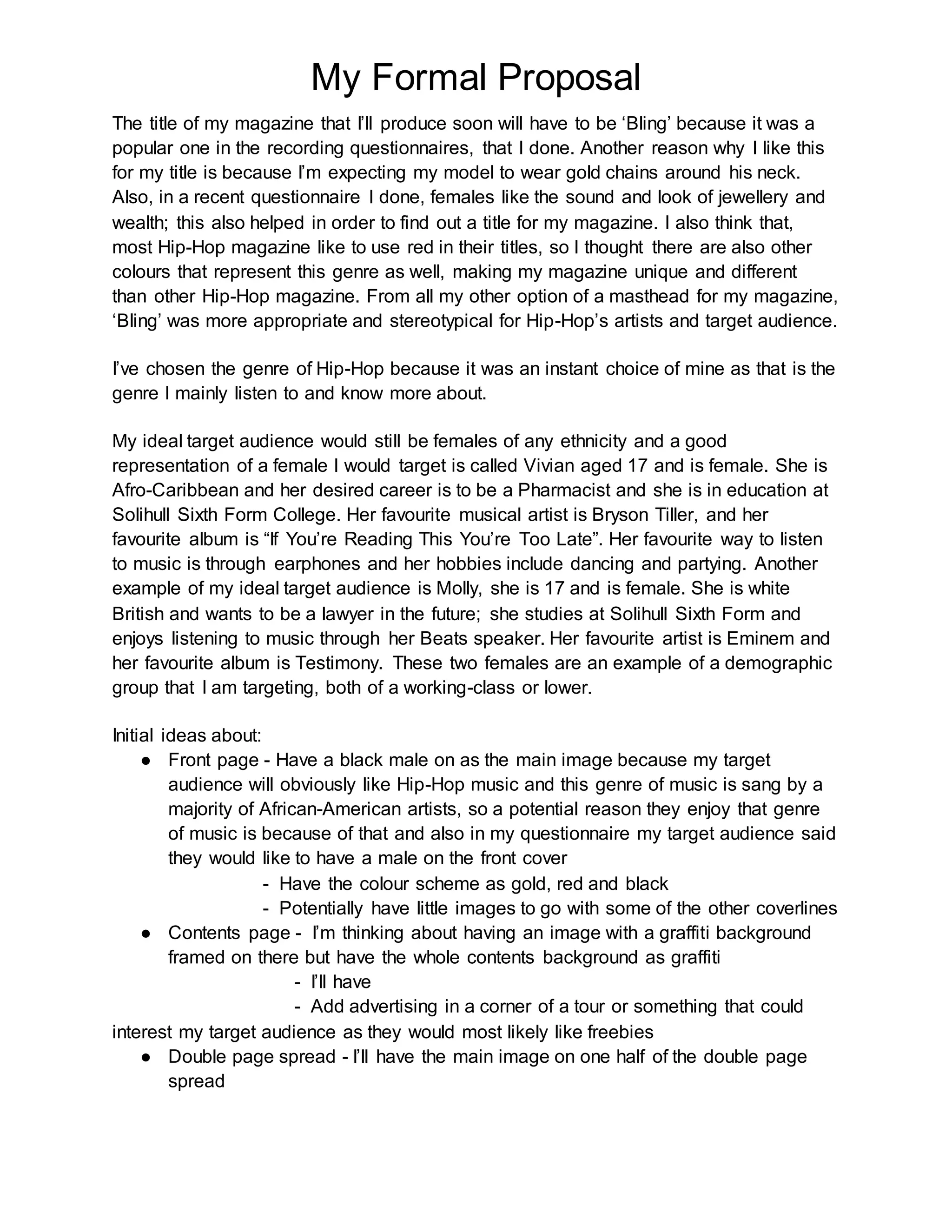 This document outlines a proposal for a magazine called "Bling" targeting female hip-hop fans ages 17-18. The magazine will focus on hip-hop music and culture featuring photos of male artists. The front cover will feature a black male model against a gold, red, and black background. Interior pages will have a graffiti theme with images of male and female models in poses reflecting hip-hop styles and moods. Advertisements and information on concerts will also be included.