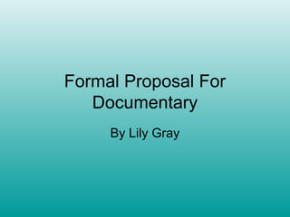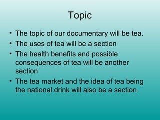 This formal proposal outlines a documentary titled "Bags for Life" about tea that will air on Channel 4. The documentary will explore the uses of tea, health benefits and risks of tea drinking, and tea's role as a national drink. It will feature interviews with professionals in the tea industry, a hairdresser who uses tea to dye hair, a tea leaf reader, a dietician discussing tea's health effects, and members of the public who drink tea. The target audience is people aged 16-30, and the documentary is scheduled to air on Wednesdays at 7pm on Channel 4 to attract viewers from surrounding shows.