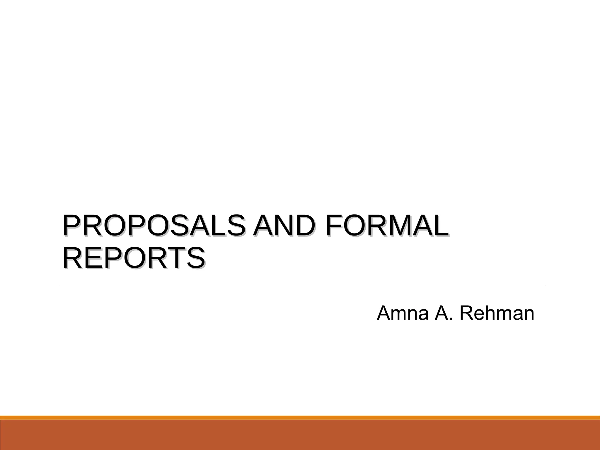 The document discusses proposals and formal reports. It defines a proposal as a persuasive document to motivate spending, making or saving money. Proposals can be internal, external, formal or informal. An informal proposal has six main parts: introduction, background, proposal, staffing, budget, and authorization request. A formal proposal includes these parts plus additional sections like a letter of transmittal and executive summary. The document also discusses formal reports, including researching secondary data, generating primary data, organizing report data, illustrating data visually, and the typical parts of a formal report like the title page, executive summary and references.