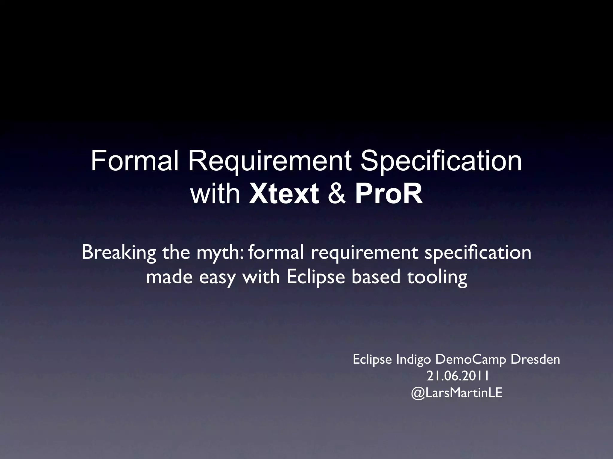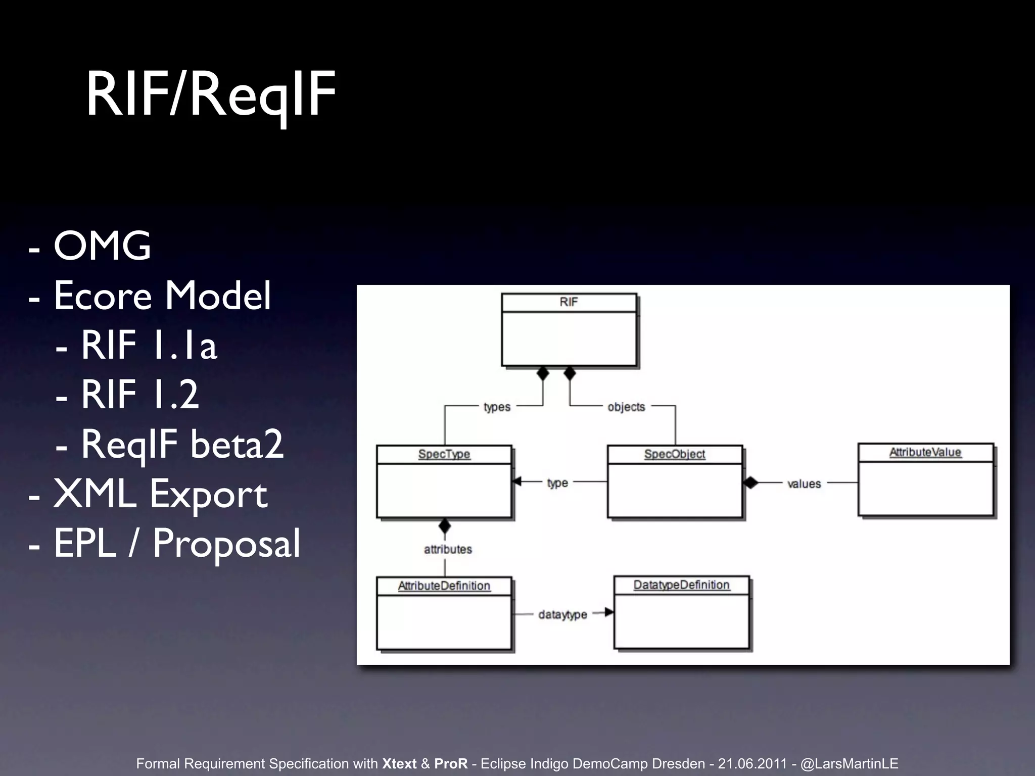 The document presents a formal requirement specification using Xtext and PROR, showcased at the Eclipse Indigo Democamp in Dresden on June 21, 2011. It discusses various topics including the RIF/REQIF standards, ecore models, and tools for XML export and EMF serialization. Key contributors and links to Eclipse resources are also highlighted.