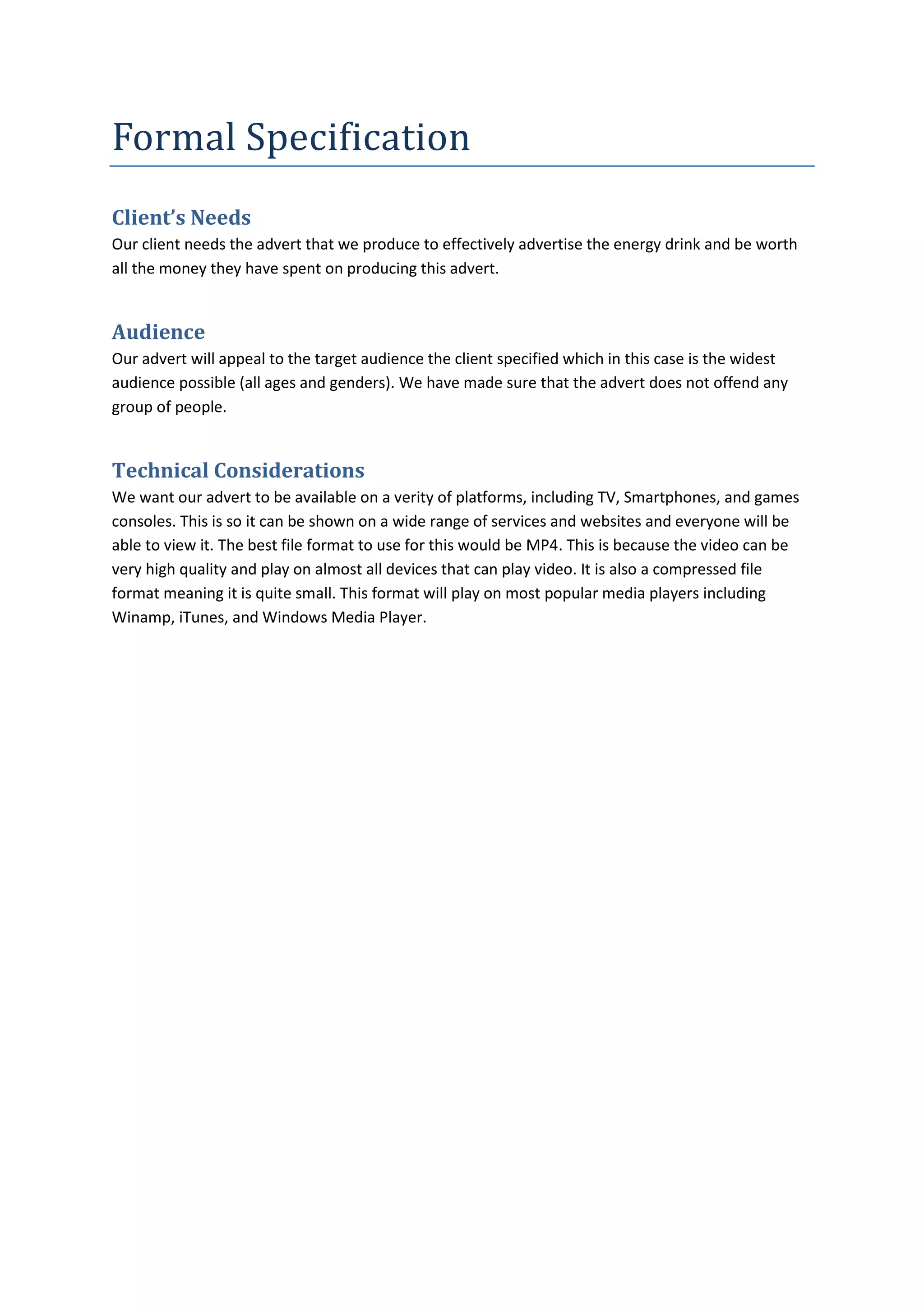 Our client needs the energy drink advert to be effective and worth the budget. The advert aims to appeal to all ages and genders without causing offense. To reach the widest possible audience, the advert should be distributed in MP4 format which provides high quality playback across TVs, smartphones, games consoles, and various media players.