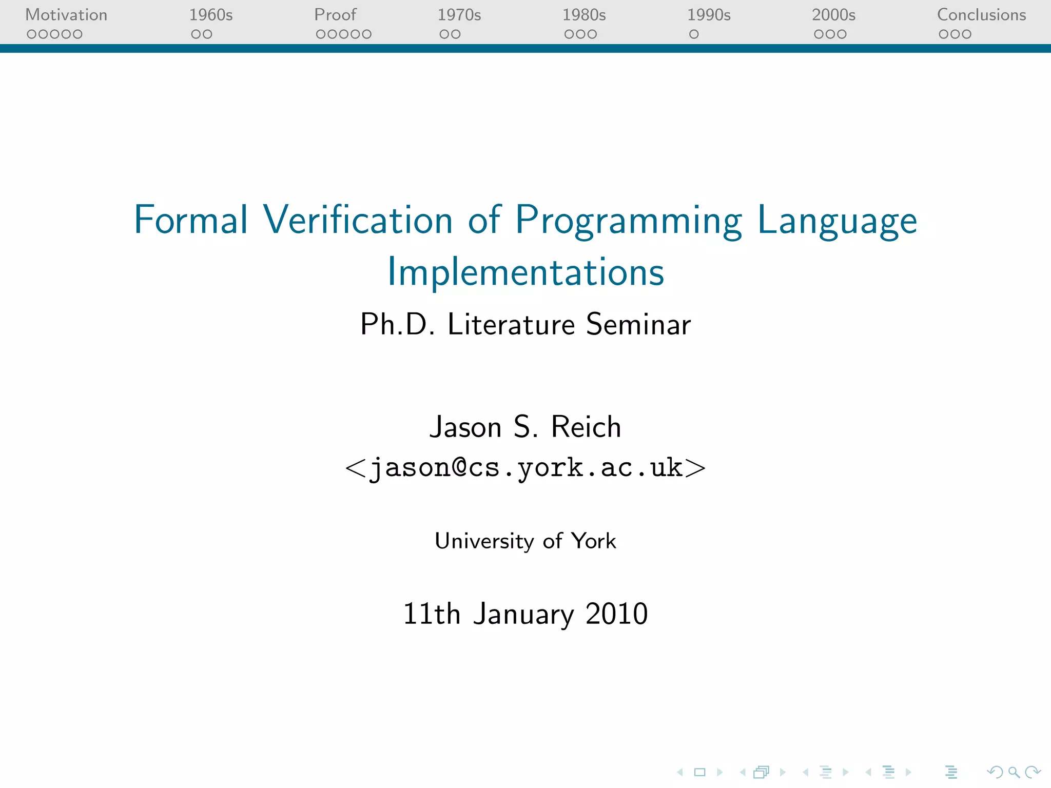 The document discusses the history of formally verifying programming language compiler implementations from the 1960s to the 2000s. It summarizes early work in the 1960s and 1970s proving correctness of compilers for simple arithmetic languages. Later work in the 1980s and 1990s proved correctness for compilers targeting more complex languages and using mechanized theorem proving. Recent work in the 2000s has formally verified compilers for realistic languages to low-level targets using proof assistants like Coq.