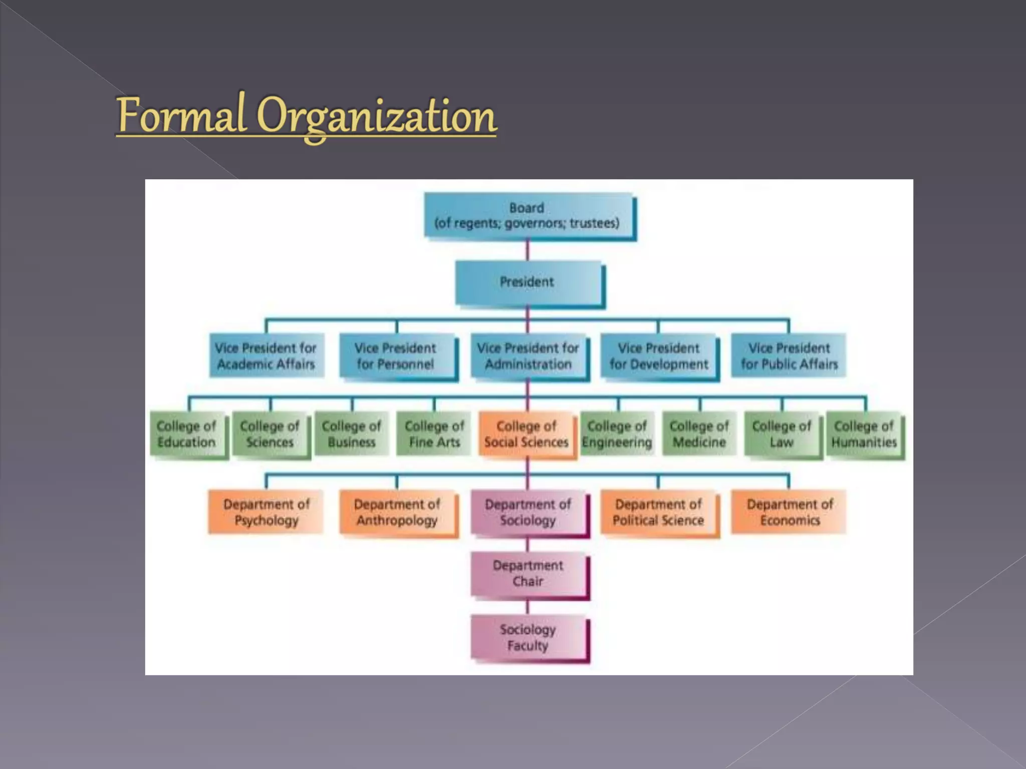 This document discusses and compares formal and informal organizations within a company. It defines a formal organization as having well-defined jobs, authority structures, and goals, while an informal organization comprises the natural relationships and networks that form among employees. Some key differences highlighted are that formal organizations have official rules and communication channels, while informal groups are dynamic and fluid, relying on personal connections. Both types of organizations serve important purposes in coordinating work and building relationships.