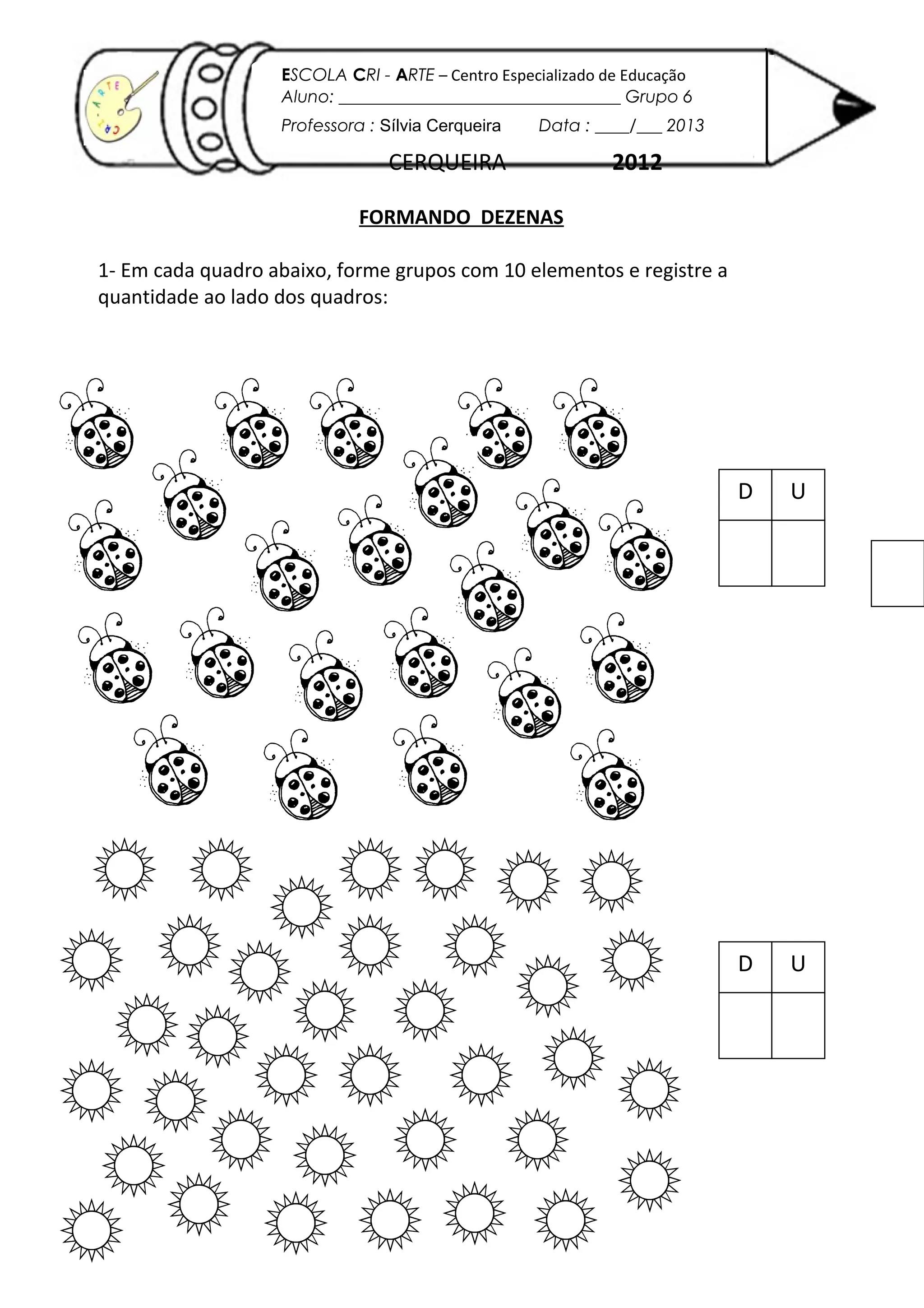 O documento fornece instruções para formar grupos de 10 elementos em quadros e registrar a quantidade. Também explica o processo de como as abelhas coletam o néctar das flores, o armazenam na garganta e o transformam em mel na colmeia através da evaporação da água e engrossamento do néctar.