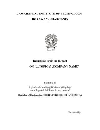 This document outlines an industrial training report submitted by a student. It includes sections on the student's profile, instructor profile, objectives of the training, daily reports, a final report on the problem/project undertaken, skills learned, and an attendance record. The report was submitted to fulfill requirements for a Bachelor of Engineering degree.