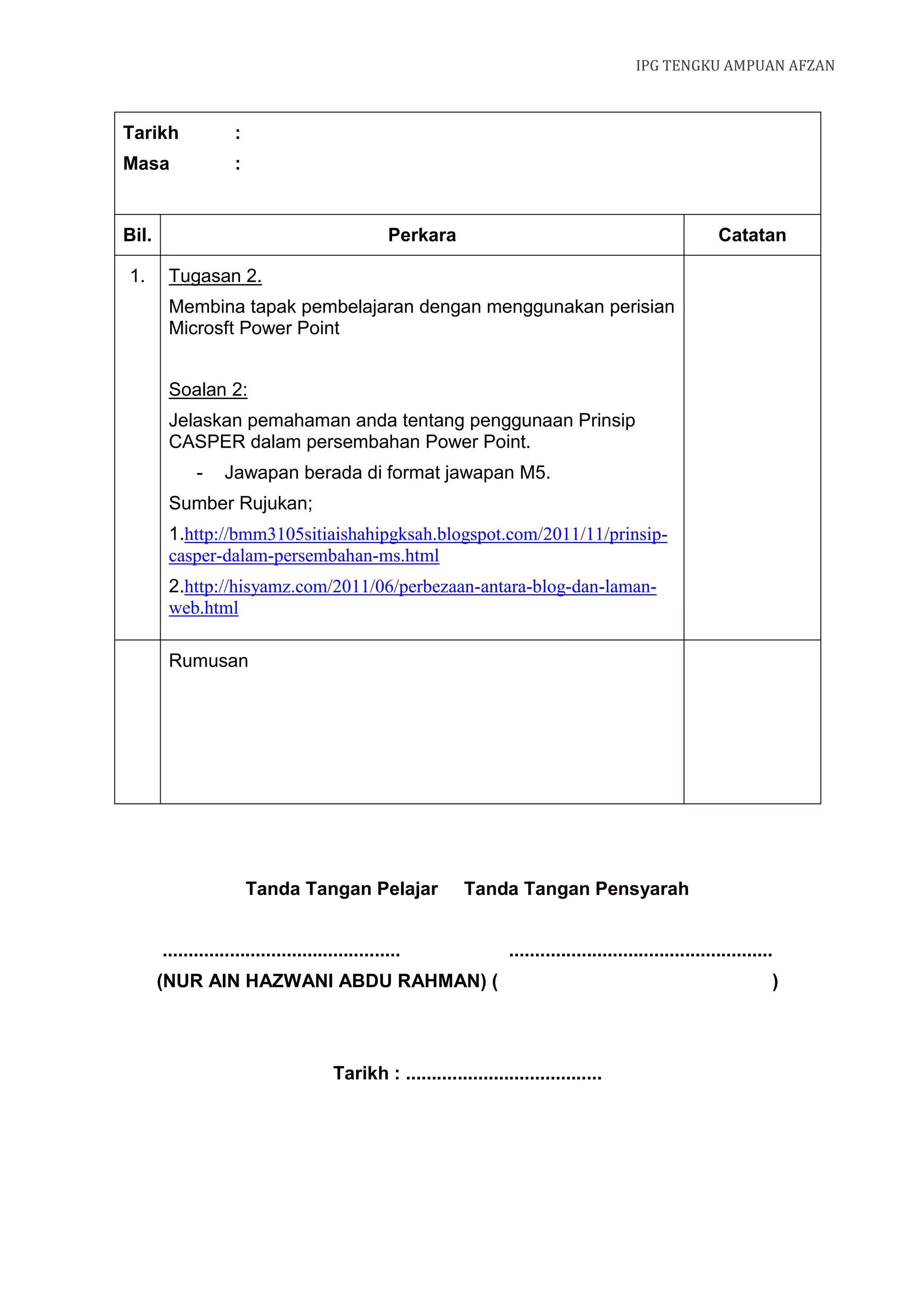 Dokumen ini adalah tentang pengajaran dan pembelajaran bahasa Melayu menggunakan teknologi komputer di IPG Tengku Ampuan Afzan. Ia merangkumi tugasan untuk membina tapak pembelajaran melalui laman web, blog, dan Microsoft PowerPoint serta soalan berkaitan perbezaan laman web dan blog serta prinsip Casper dalam persembahan. Sumber rujukan disertakan untuk membantu pelajar dalam menjawab tugasan.