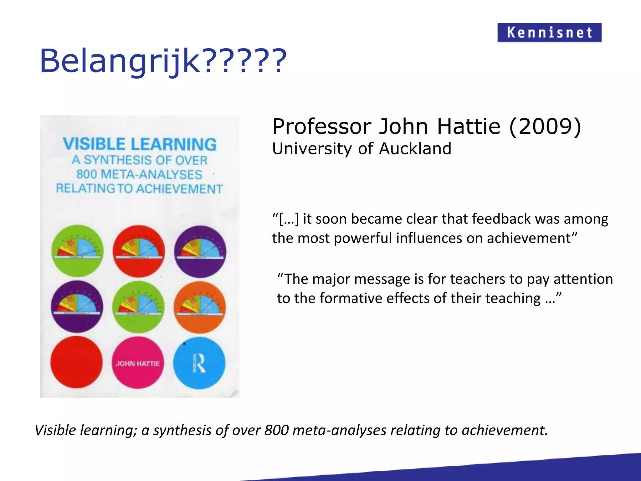 Belangrijk?????Professor John Hattie(2009)University of Auckland“[…] itsoonbecameclearthat feedback was among the most powerfulinfluencesonachievement” “The major message is forteachers to payattention to the formativeeffects of their teaching …” Visible learning; a synthesis of over 800 meta-analyses relating to achievement.