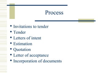 This document discusses the key steps and legal considerations in forming a building contract through the traditional procurement system in Malaysia. It explains the process from invitations to tender, tender submissions, letters of intent and acceptance, estimation and quotation, and incorporation of contract documents. Case studies are presented to illustrate legal principles regarding mistakes in tenders, acceptance of quotations forming a binding contract, and letters of intent not creating a binding contract until formalization. Alternative procurement methods like design-build are also mentioned.