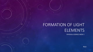 The document discusses the formation of light elements through stellar nucleosynthesis and the different stages of a star's life cycle. It explains that light elements like hydrogen, helium, and lithium were formed in the early universe during Big Bang nucleosynthesis as the extremely high temperatures and energies caused protons and neutrons to fuse together. Heavier elements are produced later during the different stages of stellar evolution as nuclear fusion occurs in stars.