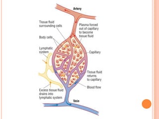 As blood flows through capillaries, some plasma leaks out through gaps between capillary cells and into the spaces between tissue cells, forming tissue fluid. Tissue fluid is similar to plasma but contains fewer protein molecules, which are too large to pass through the capillary gaps. Red blood cells also cannot pass through, but some white blood cells such as neutrophils can squeeze into the tissue fluid. Other small molecules in tissue fluid include glucose, urea, amino acids, and water. Tissue fluid is drained by the lymphatic system.