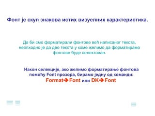 Фонт је скупзнакова истих визуелних карактеристика. Да би смо форматирали фонтове већ написаног текста, неопходно је да део текста у коме желимо да форматирамо фонтове буде селектован. Након селекције, ако желимо форматирање фонтова помоћу Font прозора, бирамо једну од команди: Format Font или DK Font