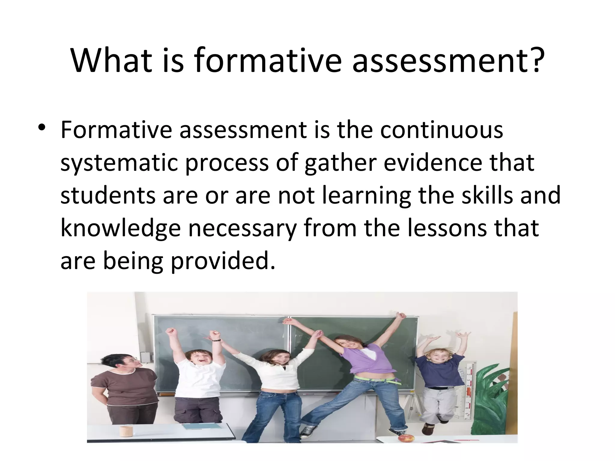 Formative assessment is a continuous process of gathering evidence of student learning. It involves observing students, questioning them, and collecting work to determine what they have and have not learned. Teachers use this evidence to provide descriptive feedback to students to help close learning gaps and improve understanding. The goal is for students to understand learning targets and criteria for success so they can independently monitor and improve their own learning.