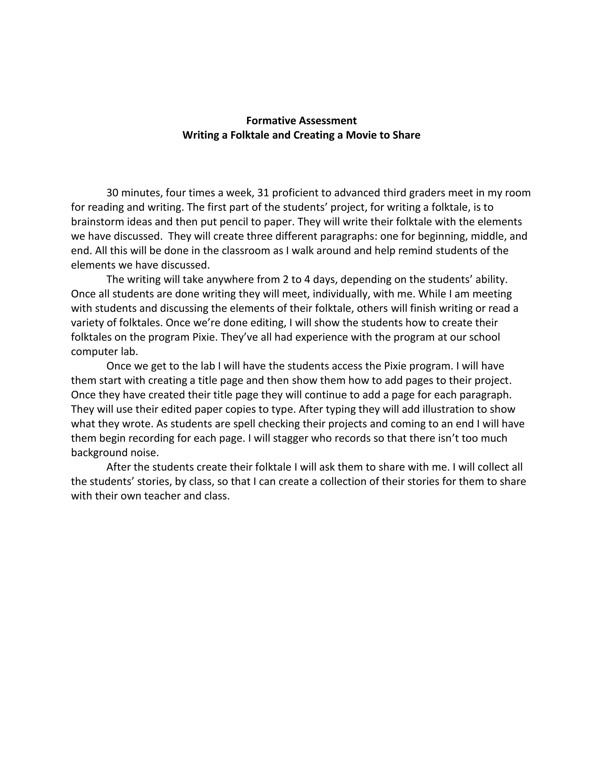 The document describes a formative assessment where third grade students will write and illustrate their own folktales. They will write their stories in three paragraphs over 2-4 days in class. The teacher will then meet with students individually to discuss and edit their stories. Next, students will use a computer program called Pixie to type their stories and add illustrations to each paragraph. They will also record their stories. Finally, the teacher will compile the students' folktales into a collection to share with their class.