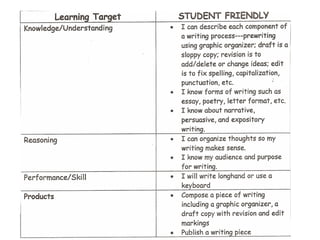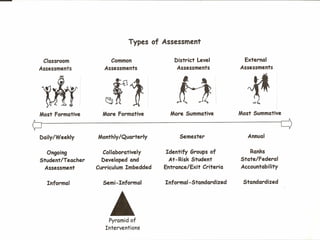 This document discusses formative assessment and providing effective feedback to students. It emphasizes the importance of having clear learning targets, assessing students in a variety of ways, and giving descriptive feedback to help students improve. Some key points covered include setting clear goals for students, communicating expectations, involving students in self-assessment, and using feedback to guide further learning.