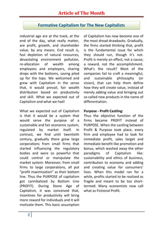 The document discusses the evolution and challenges of capitalism, emphasizing the shift from profit maximization to a purpose-driven approach amidst economic recessions. It highlights critiques from renowned economists about the sustainability of current capitalism, especially regarding its ability to regulate itself and address issues like wealth disparity and environmental degradation. The concept of 'formative capitalism' is introduced as a potential new paradigm focused on purpose, people, and shared wealth, proposing a transformative approach to ensure lasting economic prosperity.
