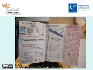 This document summarizes a scoping study on formative e-assessment commissioned by JISC. The study used a participatory methodology involving practitioners to develop design patterns for formative e-assessment. Through literature reviews and case studies, the study explored issues in formative assessment and the role of technology. Workshops were held to develop patterns from case stories and apply them to future scenarios. The study concluded that collaborative elicitation of patterns from cases has potential for professional development, but formative e-assessment is a complex topic that requires further work.