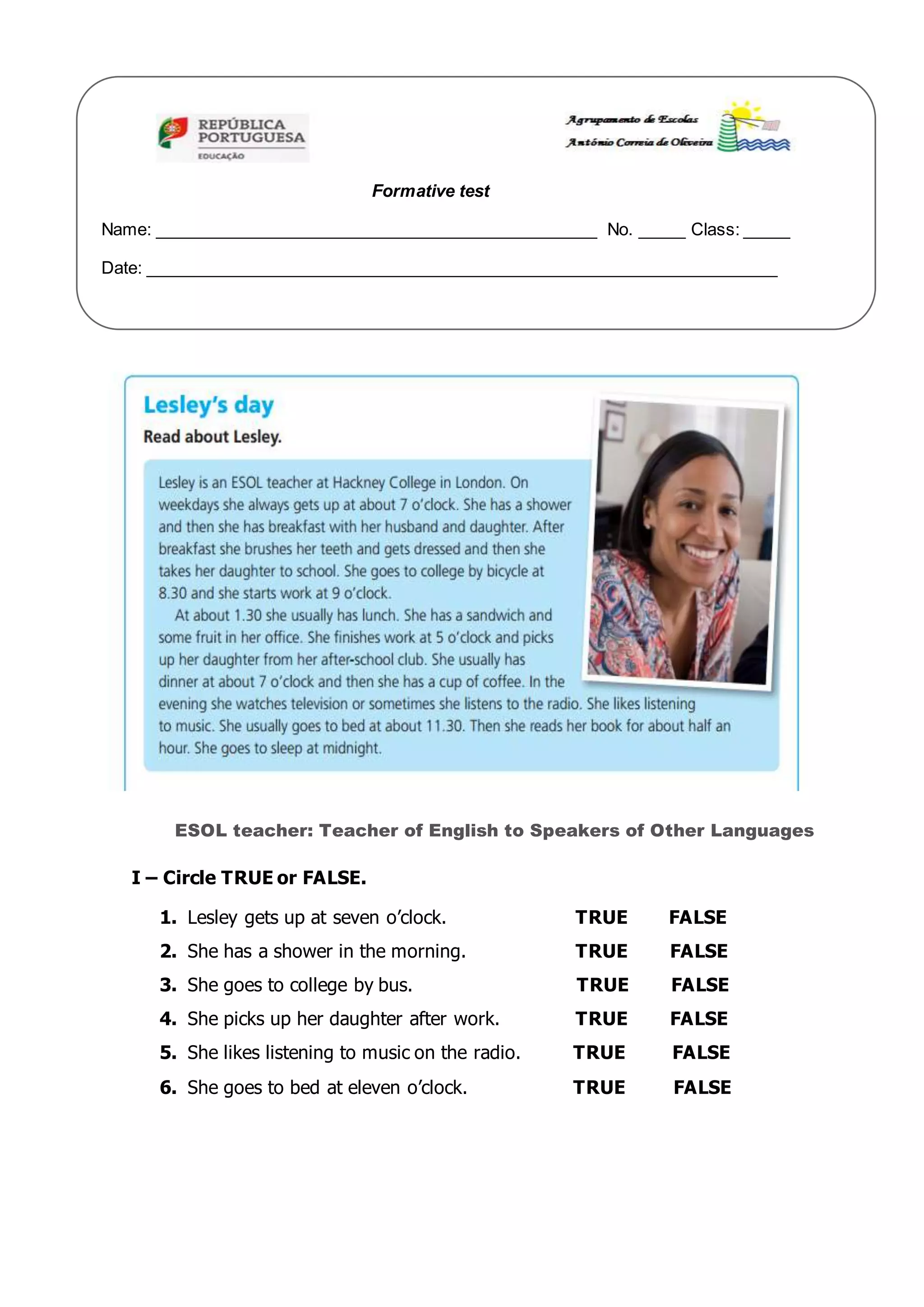 This document contains an English lesson about daily routines for ESOL (English for Speakers of Other Languages) students. It includes exercises for students to practice talking about typical daily schedules using simple present tense verbs. Students are asked to complete sentences about waking up, having meals, getting to school/work, watching TV, and going to bed. They are also prompted to ask and answer questions about their own daily routines.