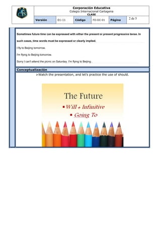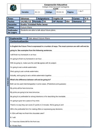 The document is an English lesson plan about future plans. It discusses different ways to express the future tense in English using will and be going to. It provides examples of their uses and differences. The lesson includes exercises for students to practice using will and be going to. It also includes a role-playing activity where students interview famous people and discuss their future plans.