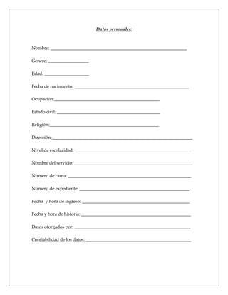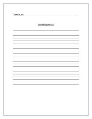 The document contains a patient intake form requesting personal details, medical history, physical exam findings, diagnosis, and case comments. It collects information on the patient's identity, health conditions, social history, family history, physical exam, neurological assessment, and presenting illness.