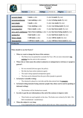 The document is a lesson plan about using the passive voice in English. It contains 3 main sections: 1) An introduction explaining the difference between active and passive sentences. 2) A conceptualization section defining the passive voice and providing examples of its use in different tenses. 3) A production section explaining when the passive voice should be used, including examples. The lesson concludes with an exercise asking students to change active sentences to passive.