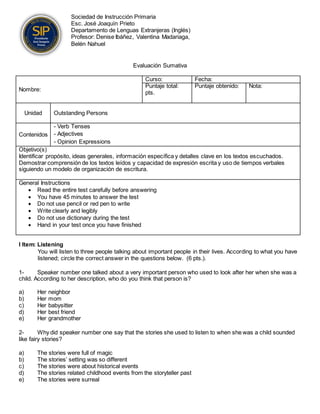 This document contains an evaluation test for English students. It has three sections that assess listening comprehension, grammar, and writing. The listening section contains 6 multiple choice questions about 3 speakers discussing important people in their lives. The grammar section contains 10 blanks to be filled in with the correct verb tenses. The writing section asks students to answer questions and write a letter based on a speech about environmental protection. The test is designed to evaluate students' English comprehension and expression abilities.
