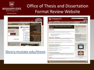 This document outlines the requirements and guidelines for formatting and converting theses and dissertations at MSU, as specified by the Graduate School and MSU Libraries. It details upcoming workshops, key formatting rules, margin settings, page numbering, and abstract formatting. Additionally, contact information for assistance with questions regarding Microsoft Word and formatting reviews is provided.