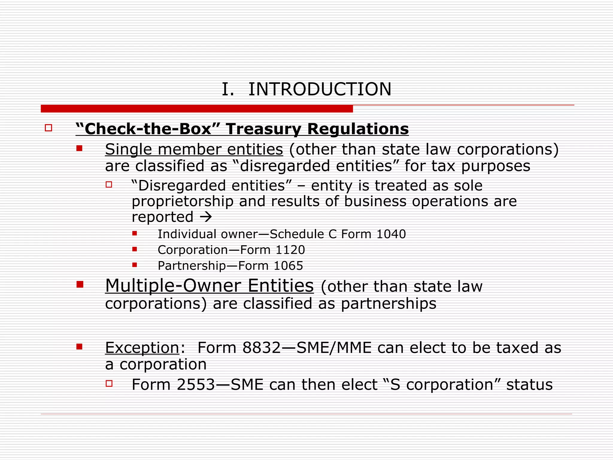 The document outlines tax considerations for various business entities, including sole proprietorships, partnerships, and corporations, focusing on their classification for tax purposes and the implications of their structure on taxation. It details the requirements for S corporations and addresses issues related to the sale of businesses, property distributions, and the recognition of gains or losses. Additionally, it explores the impact of entity choice on taxation and the specific tax treatment of different transaction types.