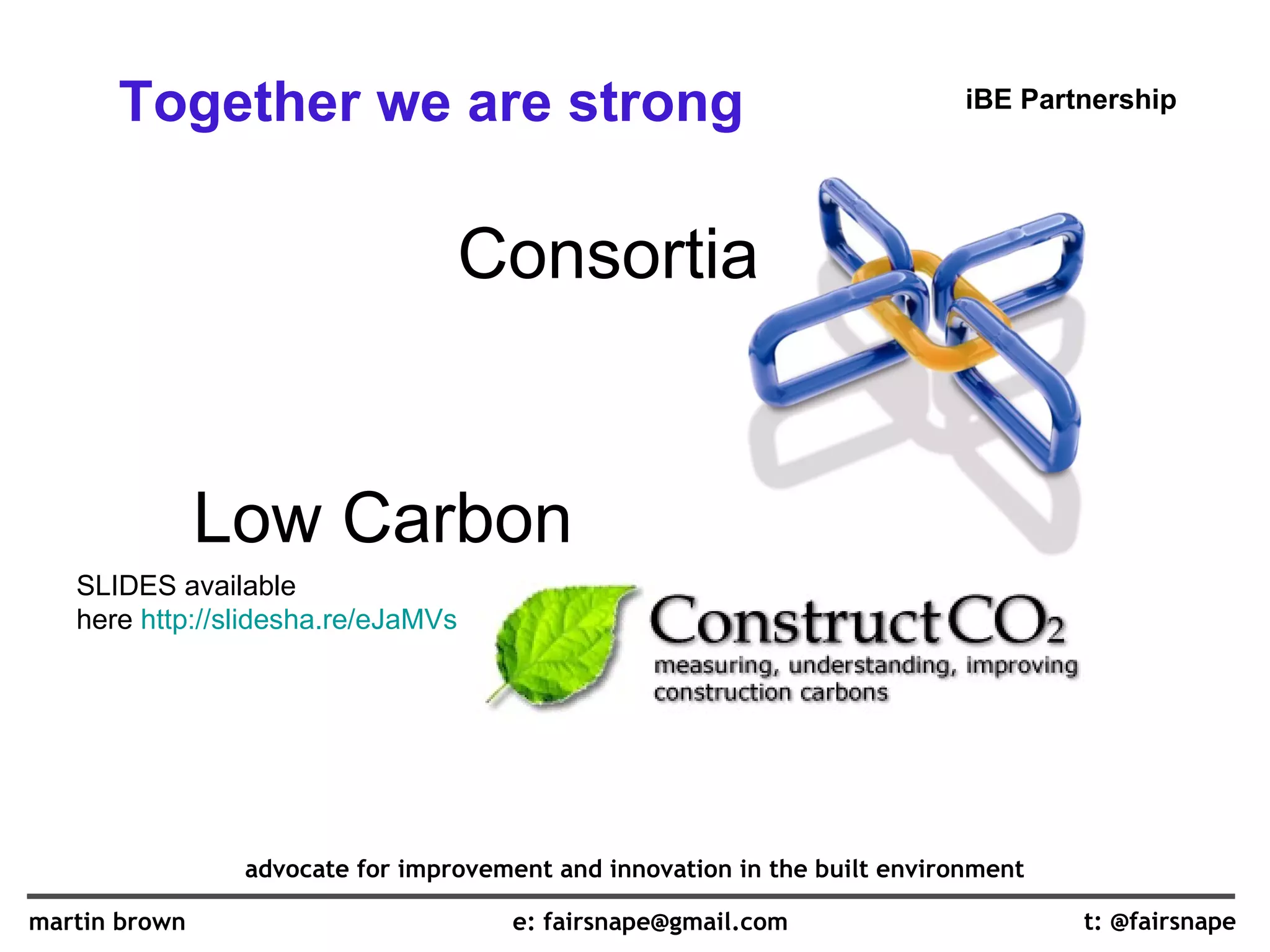 The document discusses the benefits of forming construction consortia. It notes that consortia can help members overcome financial thresholds to win contracts, while maintaining their own identities. Consortia are attractive to clients because they offer lower overhead costs and a more personal service. The document provides examples of different types of consortia structures and advises on how to successfully bid for work and operate as a consortium by emphasizing unity, values, and learning from each other.