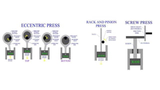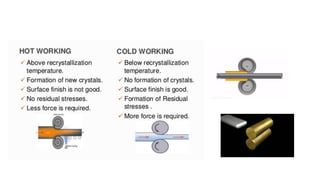 The document discusses metal forming technology, focusing on the mechanical deformation process utilized to shape metal components without altering mass. It outlines various forging methods such as smith forging and impression die forging, emphasizing their applications and classifications. Additionally, it covers powder metallurgy, detailing its procedural steps and significance in enhancing mechanical properties of metal powders.