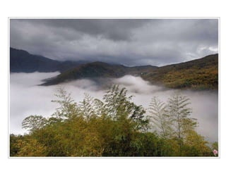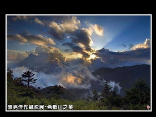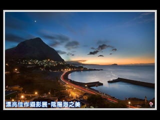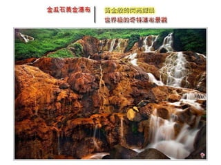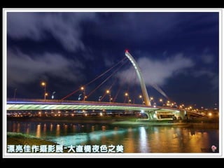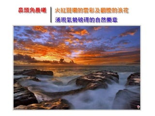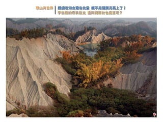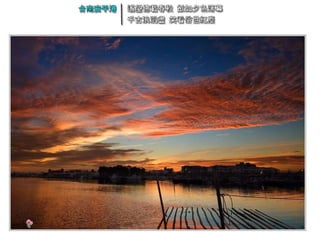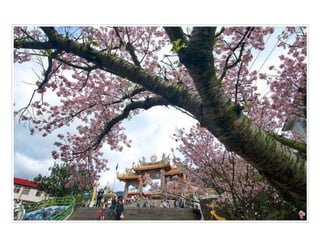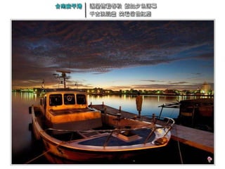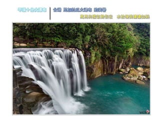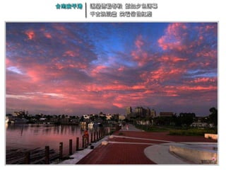 文档介绍了台湾多个自然景观,包括泰崗桃花园、高美埤塘、高美湿地和淡水渔人码头。还提到了苏花公路和台北101等地标。整体展示了台湾河川及其美丽的自然环境。