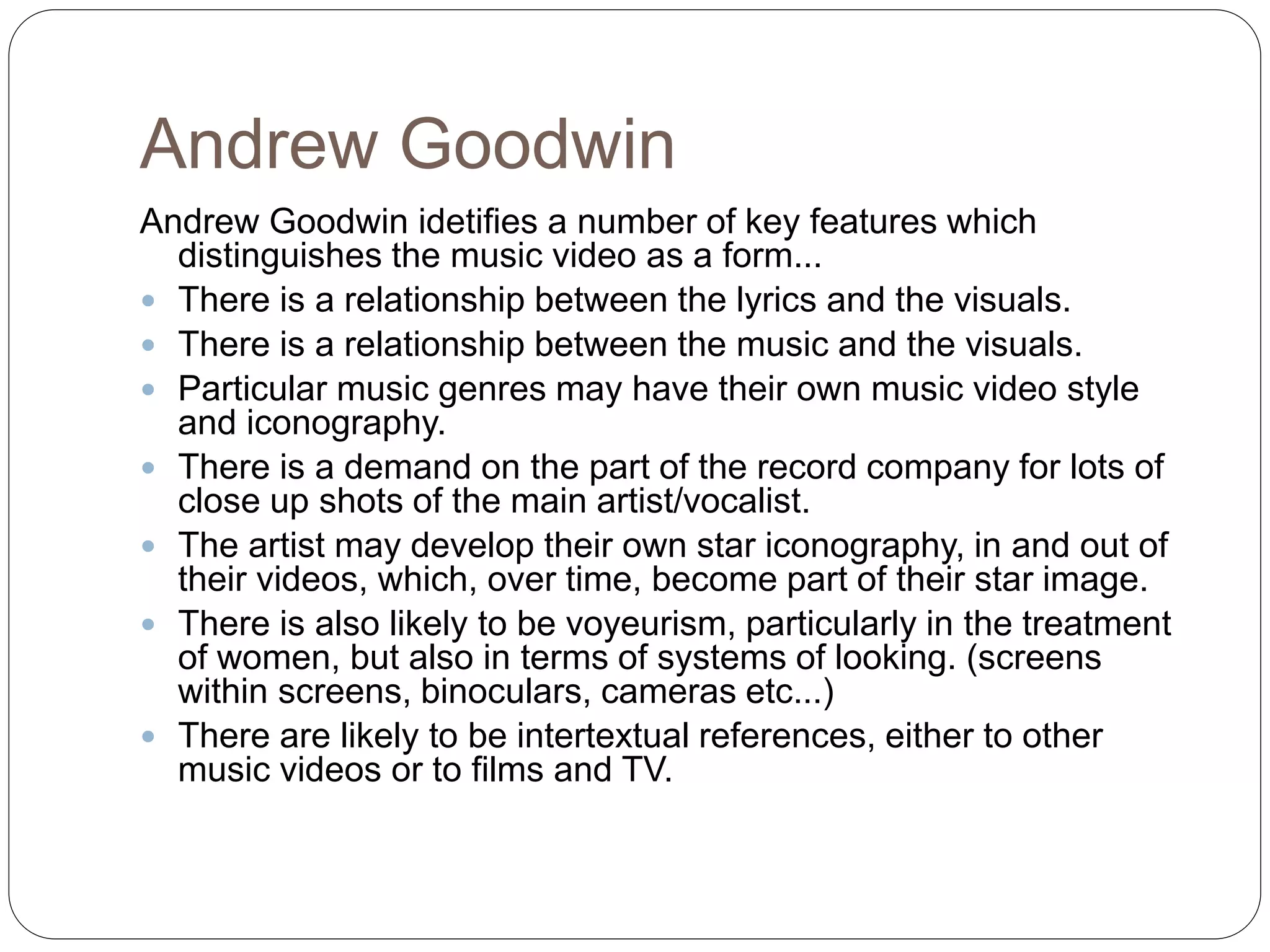 The document discusses several key features and conventions of music videos. It identifies that there are typically relationships between the lyrics, music, and visuals in a music video. Music videos also often feature close-up shots of the main artist and develop their star iconography. Genre influences the style and themes of different music videos. Camerawork, editing, and effects are also important elements that impact the meaning and feel of a music video. Editing may involve fast cuts or slower pacing depending on the desired mood.