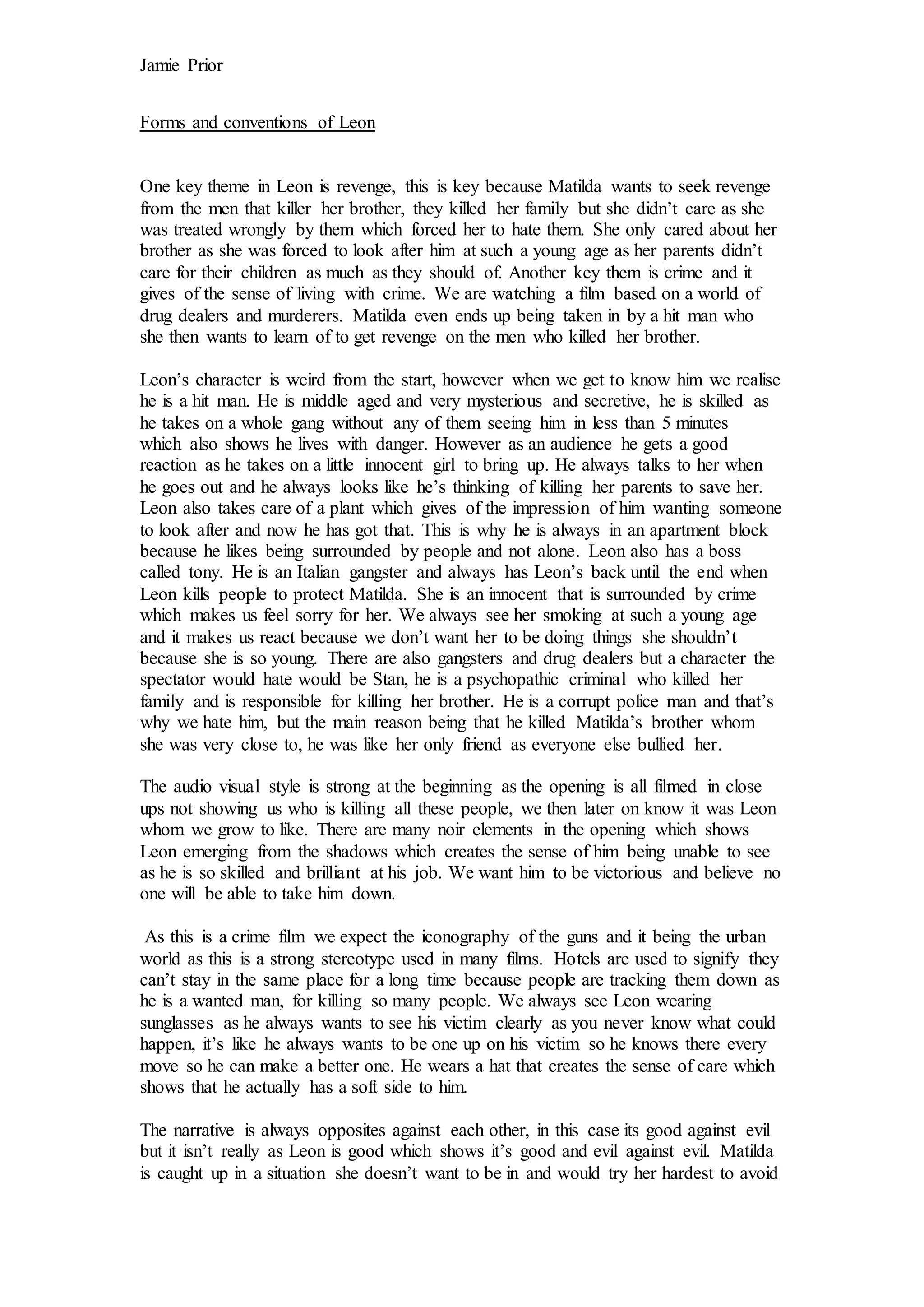 1) The key themes in Leon are revenge and crime. Matilda seeks revenge against the men who killed her brother.