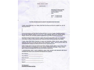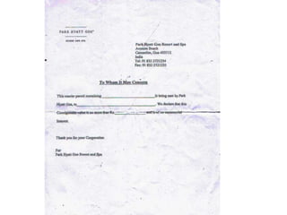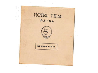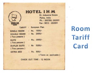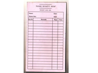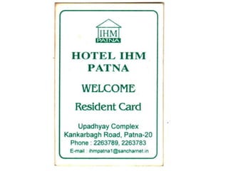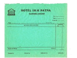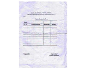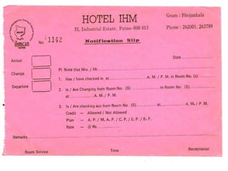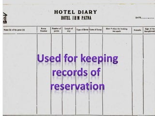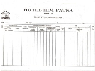 The document contains scanned images of various forms and documents commonly used in hotel front offices to help students learn concepts of hotel record keeping. It begins with demo formats from the Institute of Hotel Management in Hajipur, Bihar, India, which are old but relevant for learning. The rest of the document displays images of forms like room keys, luggage tags, maps, rate cards, parking tickets and more that were collected from hotels during student internships.
