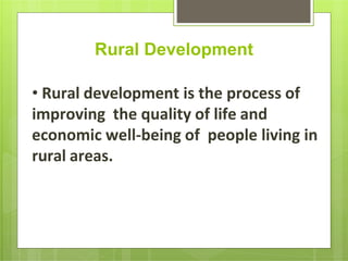 This document discusses different forms of community development including rural development, urban development, and tribal development. It outlines key problems faced in each area such as people and infrastructure issues in rural development and lack of affordable housing and pollution in urban development. The document also lists several government programs aimed at each type of community development, such as the Mahatma Gandhi National Rural Employment Guarantee Act for rural development and the Smart Cities initiative for urban development.